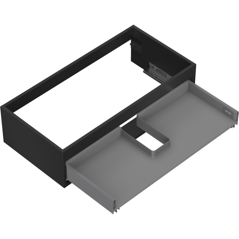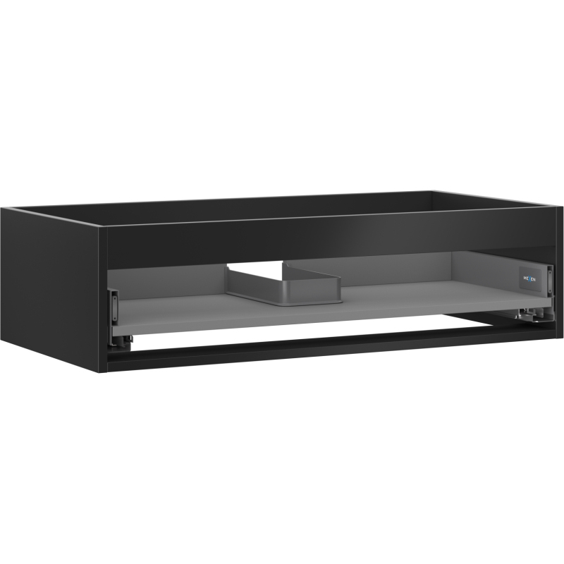 Špecifikácia produktu: Šírka: 90 cm Hĺbka: 44,2 cm Výška: 23,5 cm Farba: Matná čierna Typ: Závesné Materiál: Lakovaná doska Počet zásuviek: 1 Vodítka s funkciou tlmeného dovierania Plný výsuv pre ľahký prístup k obsahu zásuvky Povrch odolný voči UV žiareniu Kombinovateľný s d