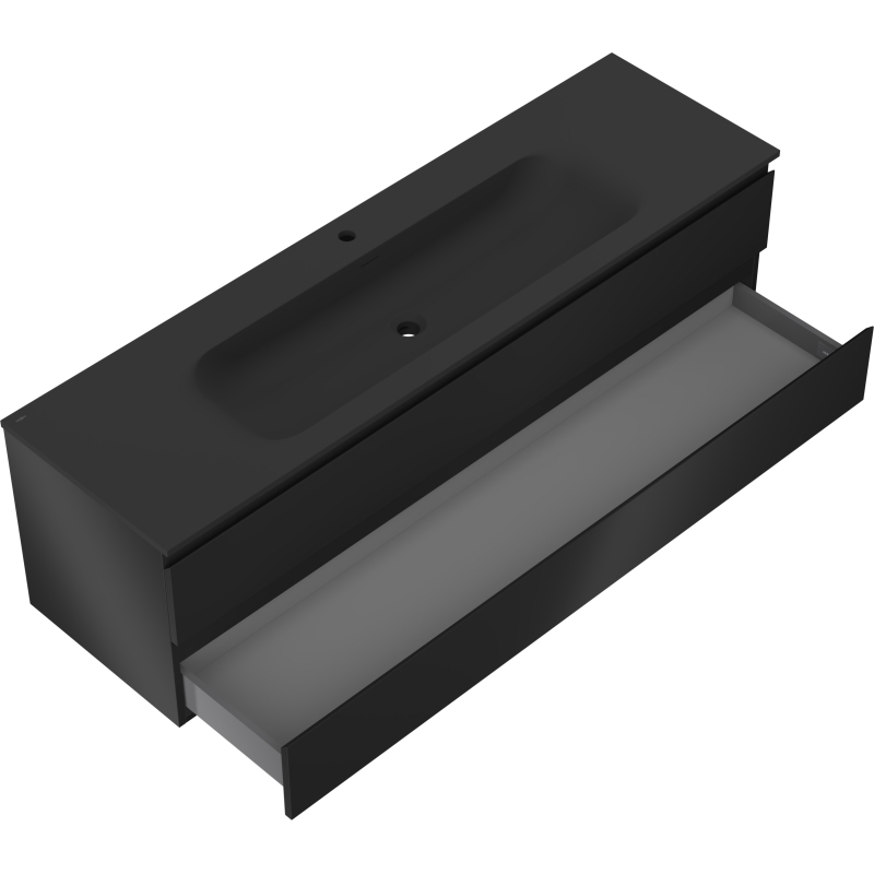 Specifikace produktu: Rozměry skříňky: Šířka: 160 cm Hloubka: 46 cm Výška: 47 cm Barva korpusu: Matná černá Materiál korpusu: Lakovaná deska Barva čela: Matná černá Materiál čela: Lakovaná MDF deska Struktura čela: Hladká Počet zásuvek: 2 Prostorná zásuvka s funkcí tlumeného dovírání Povrch odolný vůči UV záření Rozměry umyvadla: Šířka: 161 cm Hloubka: 46,5 cm Výška: 16,5 cm Barva umyvadla: Matná černá Materiál umyvadla: Konglomerát Otvor pro přepad: Ano Otvor pro baterii: Ano Smontovaný výrobek