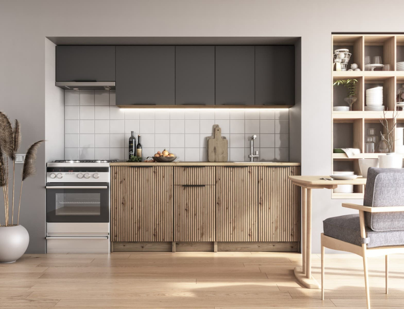 Kompletná kuchynská linka vrátane pracovnej dosky. Bez spotrebičov, drezu, batérie.