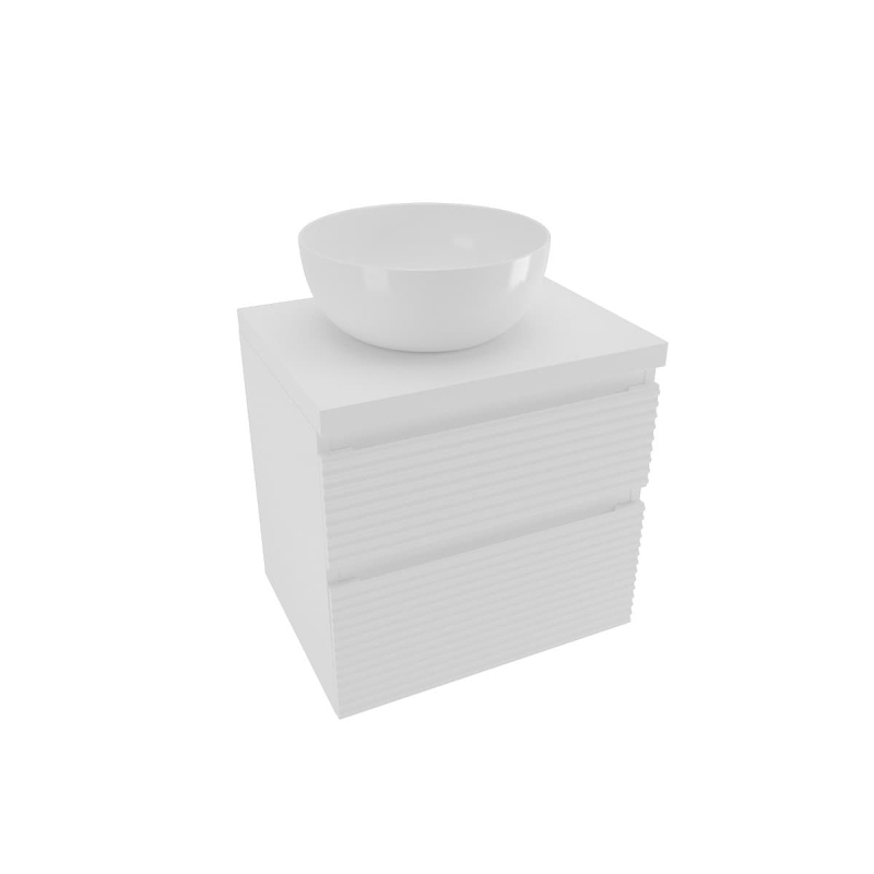 Závesná kúpeľňová skrinka s krycou doskou v bielej farbe v lesklom prevedení o rozmere 58x53x44,8 cm. Povrch v prevedení lamino.