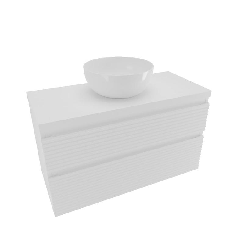 Závesná kúpeľňová skrinka s krycou doskou v bielej farbe v lesklom prevedení o rozmere 98x53x44,8 cm. Povrch v prevedení lamino.