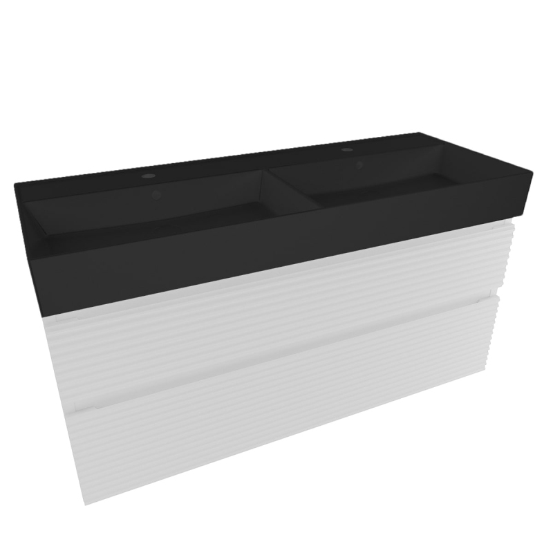 Závesná kúpeľňová skrinka s keramickým umývadlom v bielej farbe v lesklom prevedení o rozmere 118x53x44,8 cm. Povrch v prevedení lamino.