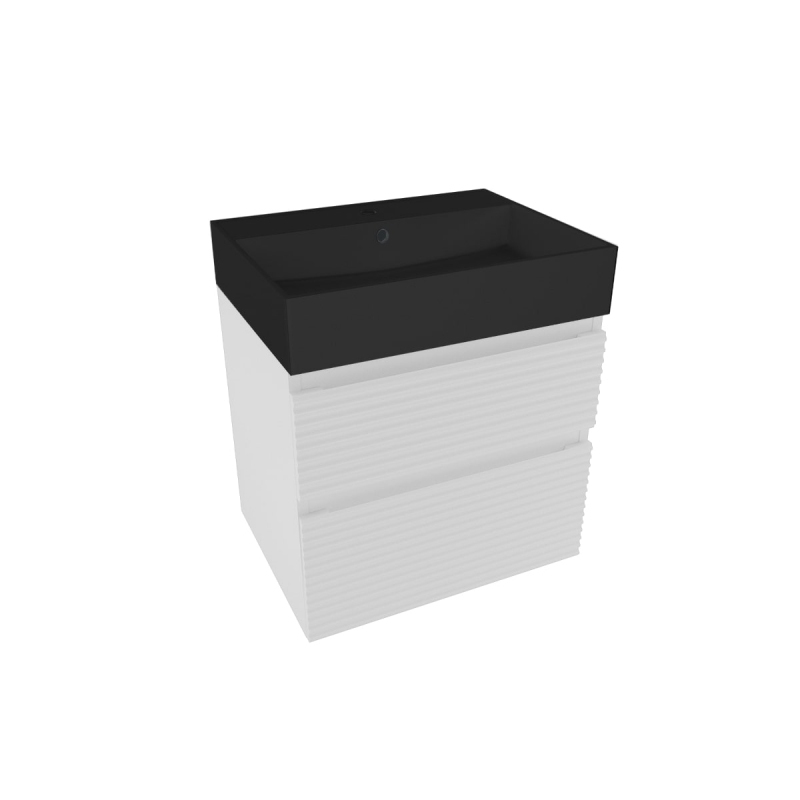 Závesná kúpeľňová skrinka s keramickým umývadlom v bielej farbe v lesklom prevedení o rozmere 58x53x44,8 cm. Povrch v prevedení lamino.