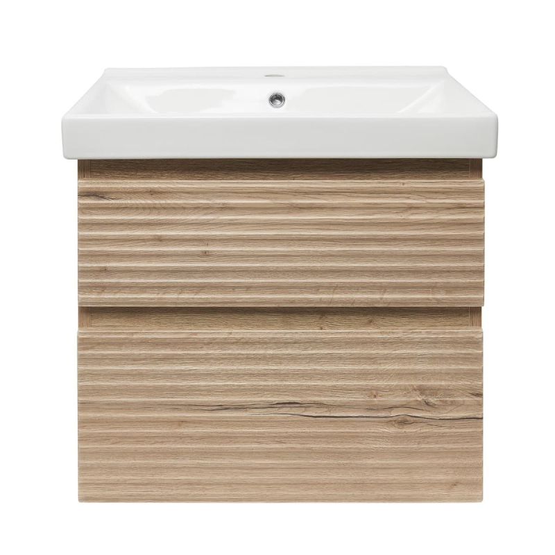Závesná kúpeľňová skrinka s keramickým umývadlom v dekore dub halifax s matným povrchom o rozmere 58x53x44,8 cm. Povrch v prevedení lamino.