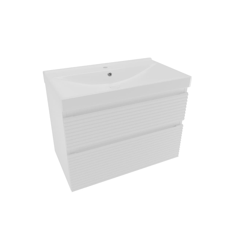 Závesná kúpeľňová skrinka s keramickým umývadlom v bielej farbe s lesklým povrchom o rozmere 78x53x44,8 cm. Povrch v prevedení lamino.