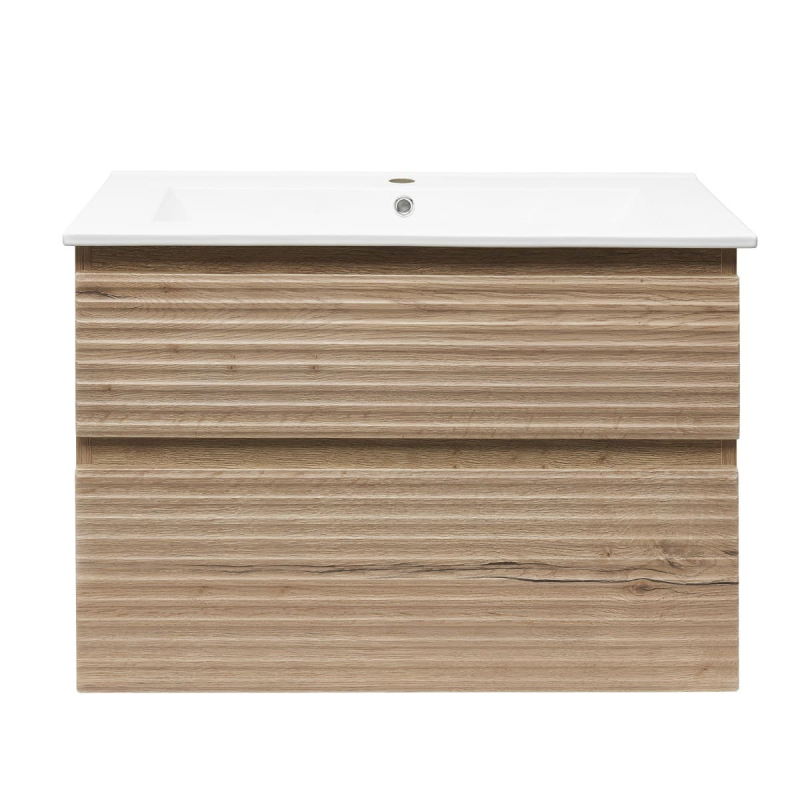 Závesná kúpeľňová skrinka s keramickým umývadlom v dekore dub halifax s matným povrchom o rozmere 78x53x44,8 cm. Povrch v prevedení lamino.