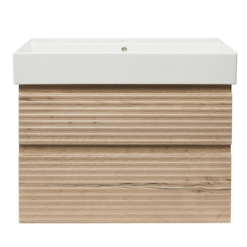 Závesná kúpeľňová skrinka s keramickým umývadlom v dekore dub halifax s matným povrchom o rozmere 78x53x44,8 cm. Povrch v prevedení lamino.