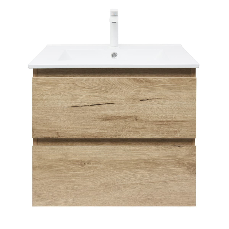 Závesná kúpeľňová skrinka s umývadlom v dekore dub v matnom prevedení o rozmere 59x50x45 cm. Povrch v prevedení lamino.