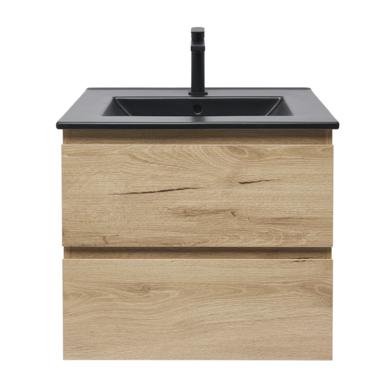 Závesná kúpeľňová skrinka s keramickým umývadlom v dekore dub v matnom prevedení o rozmere 59x50x45 cm. Povrch v prevedení lamino.