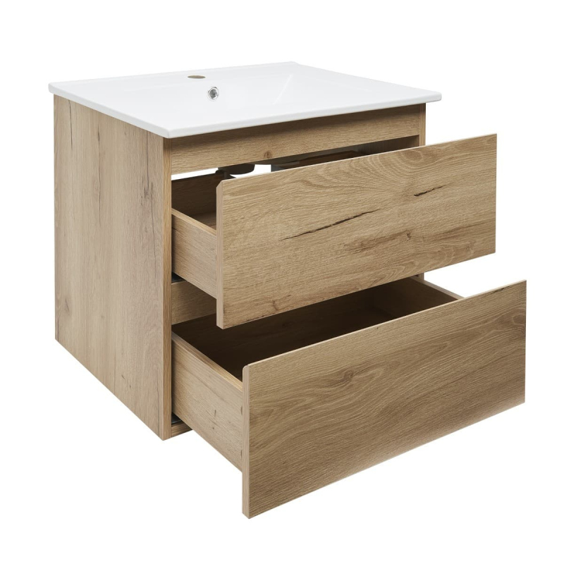 Závesná kúpeľňová skrinka s keramickým umývadlom v dekore dub v matnom prevedení o rozmere 59x50x45 cm. Povrch v prevedení lamino.