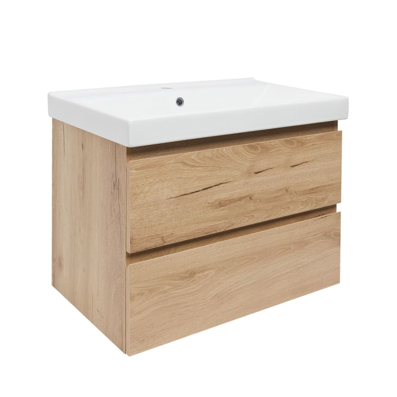 Závesná kúpeľňová skrinka s keramickým umývadlom v dekore dub v matnom prevedení o rozmere 79x50x45 cm. Povrch v prevedení lamino.