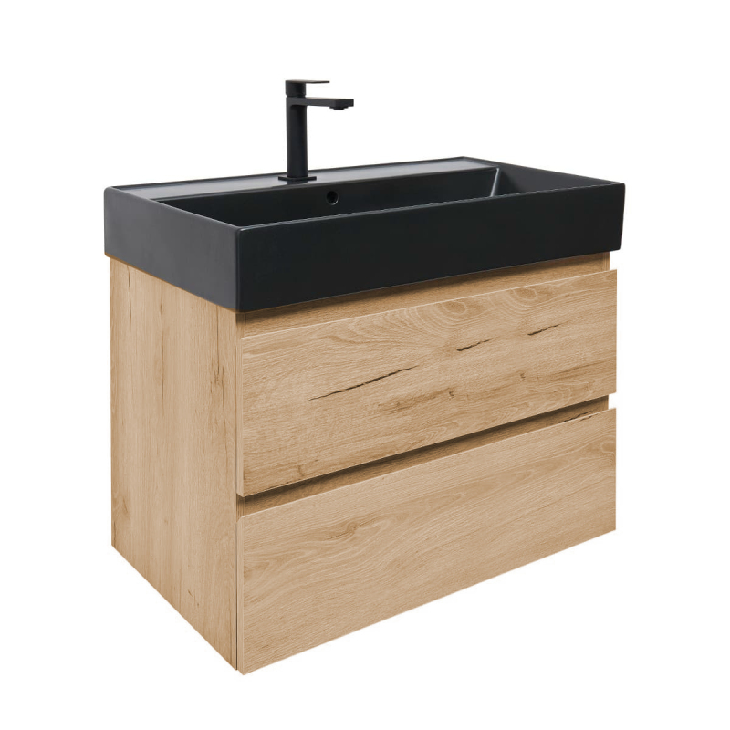 Závesná kúpeľňová skrinka s keramickým umývadlom v dekore dub v matnom prevedení o rozmere 79x50x45 cm. Povrch v prevedení lamino.