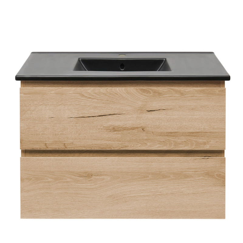 Závesná kúpeľňová skrinka s keramickým umývadlom v dekore dub v matnom prevedení o rozmere 79x50x45 cm. Povrch v prevedení lamino.