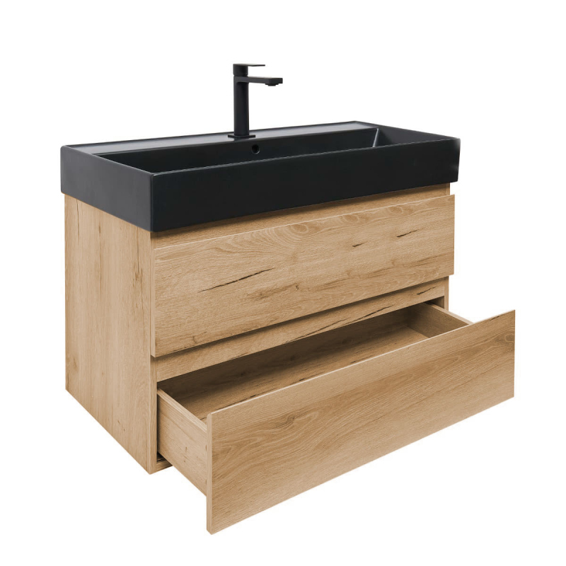 Závesná kúpeľňová skrinka s keramickým umývadlom v dekore dub v matnom prevedení o rozmere 99x50x45 cm. Povrch v prevedení lamino.