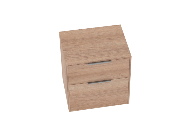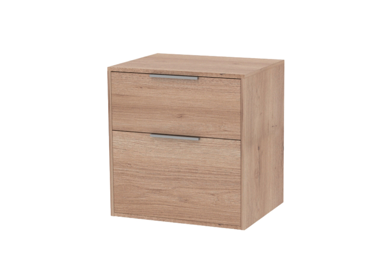 Závesná kúpeľňová skrinka bez umývadla v dekore dub s rozmerom 58,5x56,5x45,5 cm. Povrch v prevedení lamino. S plnovýsuvom a doťahom.