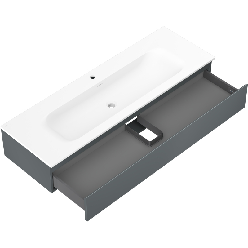 Špecifikácia produktu: Rozmery skrinky: Šírka: 140 cm Hĺbka: 46 cm Výška: 23,5 cm Farba korpusu: Matný grafit Materiál korpusu: Lakovaná doska Farba čela: Matný grafit Materiál čela: Lakovaná MDF doska Štruktúra čela: Hladká Počet zásuviek: Povrch odolný voči UV žiareniu Rozmery umývadla: Šírka: 141 cm Hĺbka: 46,5 cm Výška: 16,5 cm Farba umývadla: Matná biela Materiál umývadla: Konglomerát Otvor na prepad: Áno Otvor na batériu: Áno Zmontovaný výrobok