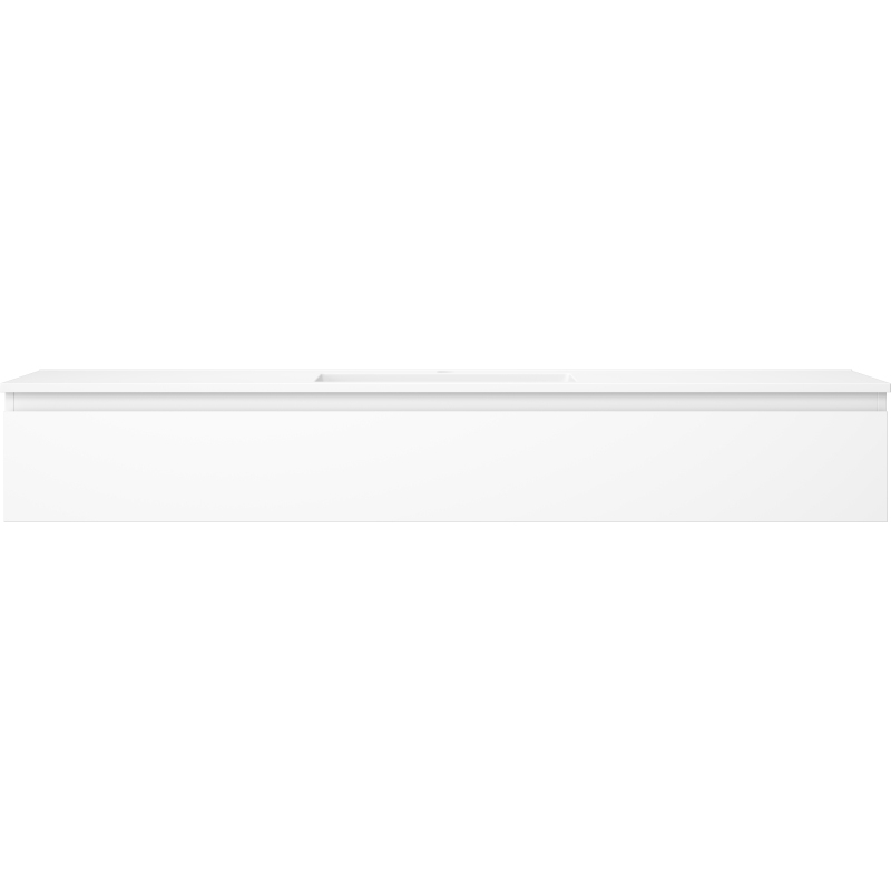 Špecifikácia produktu: Rozmery skrinky: Šírka: 160 cm Hĺbka: 46 cm Výška: 23,5 cm Farba korpusu: Matná biela Materiál korpusu: Lakovaná doska Farba čela: Matná biela Materiál čela: Lakovaná MDF doska Štruktúra čela: Hladká Počet zásuviek: Povrch odolný voči UV žiareniu Rozmery umývadla: Šírka: 161 cm Hĺbka: 46,5 cm Výška: 16,5 cm Farba umývadla: Matná biela Materiál umývadla: Konglomerát Otvor na prepad: Áno Otvor na batériu: Áno Zmontovaný výrobok