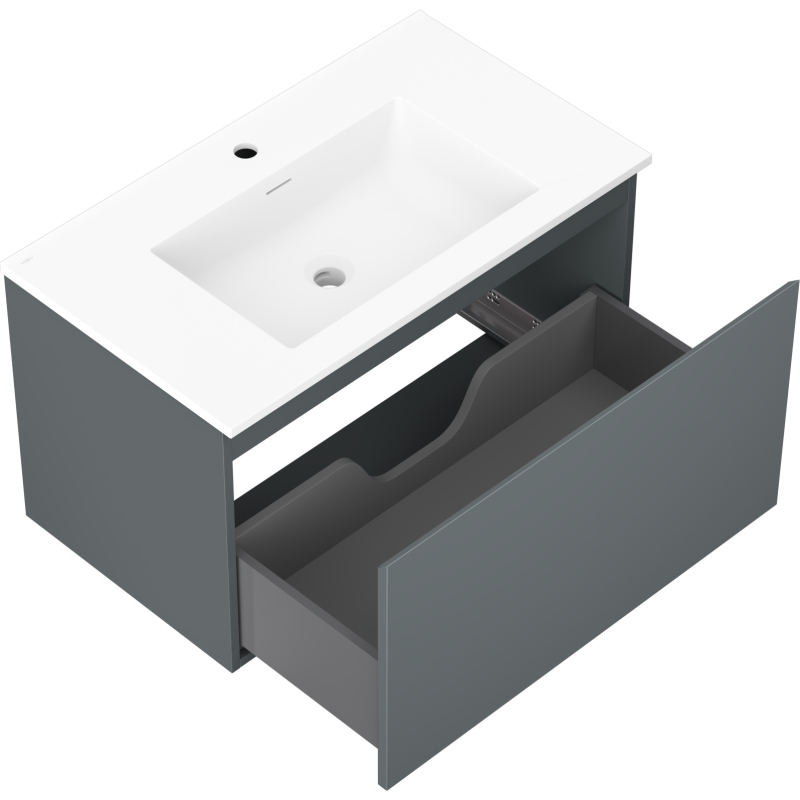 Špecifikácia produktu: Rozmery skrinky: Šírka: 80 cm Hĺbka: 46 cm Výška: 47 cm Farba korpusu: Matný grafit Materiál korpusu: Lakovaná doska Farba čela: Matný grafit Materiál čela: Lakovaná MDF doska Štruktúra čela: Hladká Počet zásuviek: 1 voči UV žiareniu Rozmery umývadla: Šírka: 81 cm Hĺbka: 46,5 cm Výška: 16,5 cm Farba umývadla: Matná biela Materiál umývadla: Konglomerát Otvor pre prepad: Áno Otvor pre batériu: Áno Zmontovaný výrobok