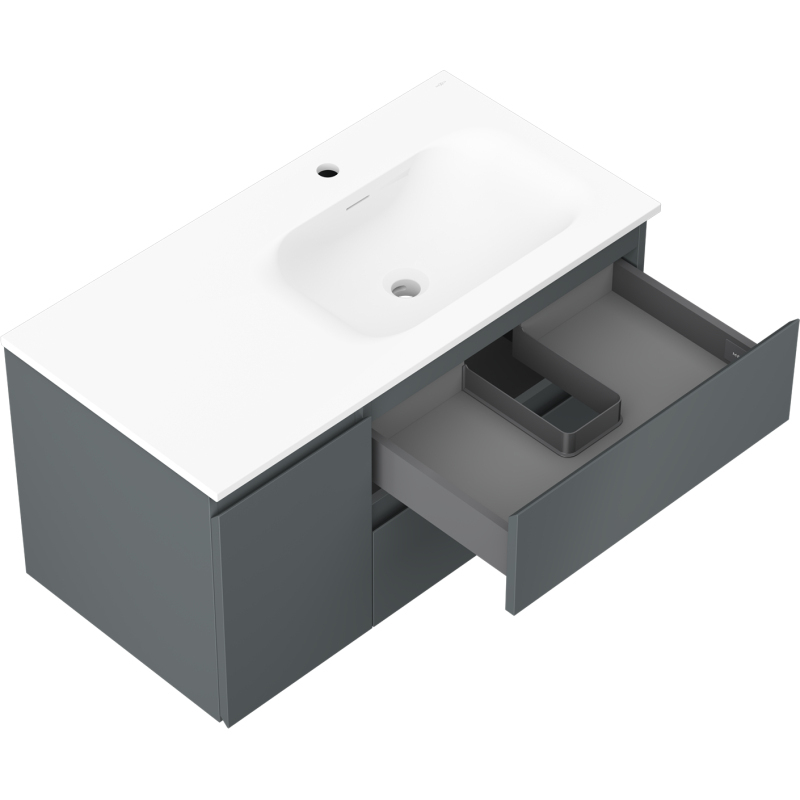 Špecifikácia produktu: Rozmery skrinky: Šírka: 90 cm Hĺbka: 46 cm Výška: 47 cm Sada obsahuje: Zásuvková skrinka pod umývadlo: Šírka: 60 cm Hĺbka: 46 cm Výška: 47 cm Farba korpusu: Matný grafit Materiál korpusu čela: Lakovaná MDF doska Štruktúra čela: Hladká Počet zásuviek: 2 Priestranná zásuvka s funkciou tlmeného dovierania Umývadlová skrinka s dvierkami: Šírka: 30 cm Výška: 47 cm Hĺbka: 46 cm Farba korpusu: Matný grafit Materiál korpus čela: Lakovaná MDF doska Štruktúra čela: Hladká Počet dvierok: 1 1 polica Pánty s funkciou tlmeného dovierania Univerzálna montáž dvierok (ľavé/pravé) UV odolný povrch Umývadlo: Šírka: 91 cm Hĺbka: 46,5 cm Výška: 16,5 cm Farba: 16,5 cm Konglomerát Otvor na prepad: Áno Otvor na batériu: Áno Zmontovaný výrobok