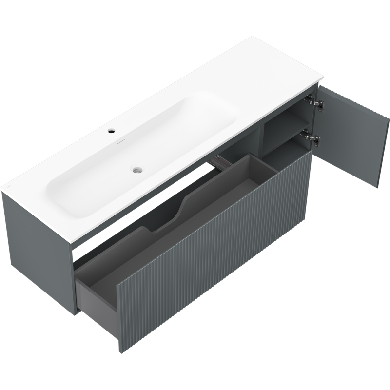 Špecifikácia produktu: Rozmery skrinky: Šírka: 160 cm Hĺbka: 46 cm Výška: 47 cm Sada obsahuje: Zásuvková skrinka pod umývadlo: Šírka: 120 cm Hĺbka: 46 cm Výška: 47 cm Farba korpusu Matný grafit Materiál čela: Lakovaná MDF doska Konštrukcia čela: Drážkovaná Počet zásuviek: 1 Priestranná zásuvka s funkciou tlmenia dovierania Povrch odolný voči UV žiareniu Skrinka pod umývadlo s dvierkami: Šírka: 40 cm Výška: 47 cm Hĺbka: 46 cm Farba korpus čela: Matný grafit Materiál čela: Lakovaná MDF doska Konštrukcia čela: Drážkovaná Počet dvierok: 1 1 polica Panty s funkciou tlmenia dovierania Univerzálna montáž dvierok (ľavé/pravé) Povrch odolný voči UV žiareniu Umývadlo: Šírka: 165 cm Hĺbka umývadlá: Matná biela Materiál umývadla: Konglomerát Otvor pre prepad: Áno Otvor pre batériu: Áno Produkt zmontovaný