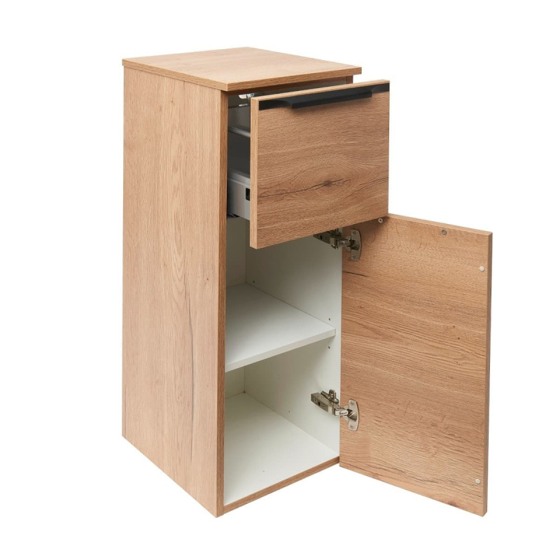 Nízka skrinka do kúpeľne 86cm, v dekore dreva dub sierra, s dvierkami a malou zásuvkou, čierne matné úchytky.