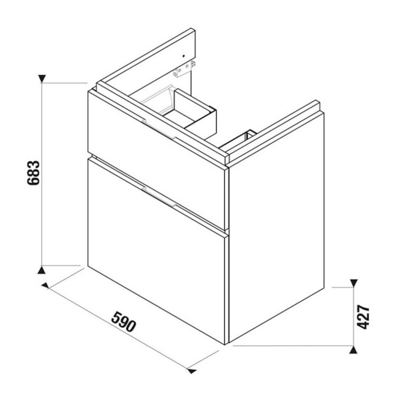 Závesná kúpeľňová skrinka pod umývadlo v dekore dub s rozmerom 59x42,7x68,3 cm.