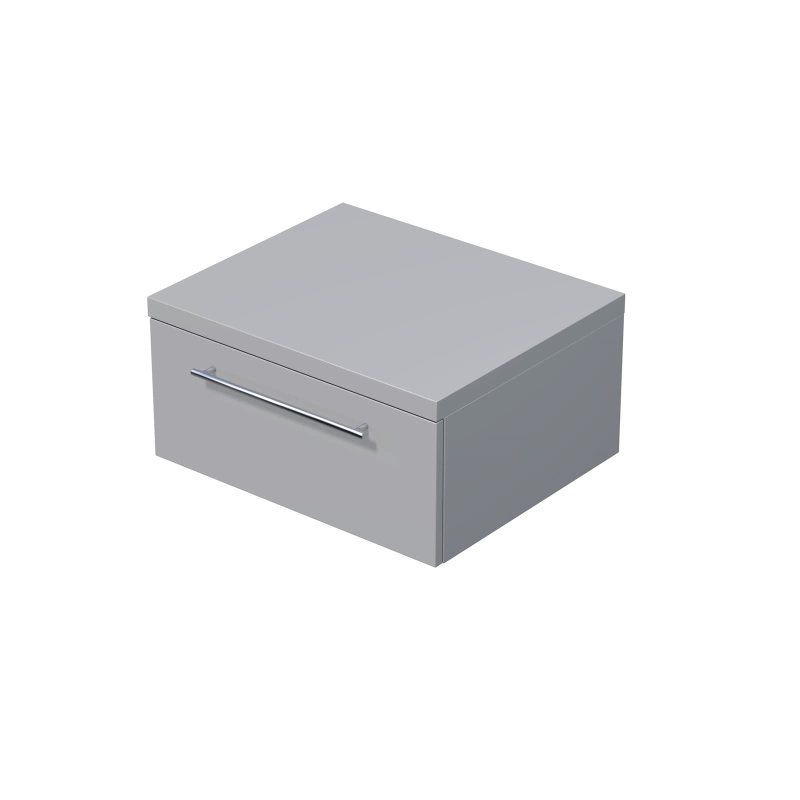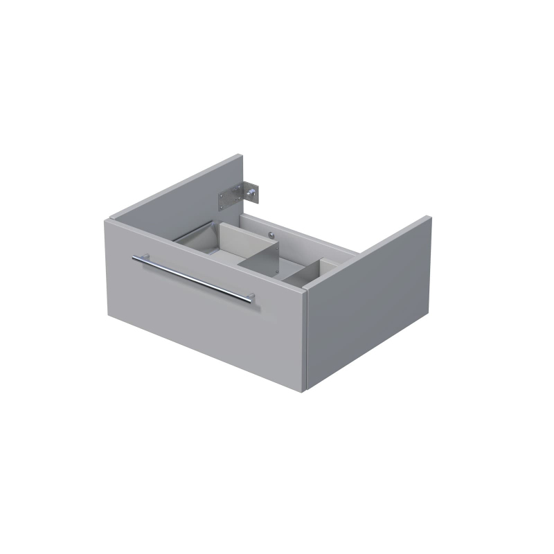 Závesná kúpeľňová skrinka pod umývadlo v šedej farbe s matným povrchom o rozmere 60x29,6x50 cm. S lakovaným povrchom s úpravou proti zanechaniu odtlačkov prstov. S plnovýsuvom a doťahom.