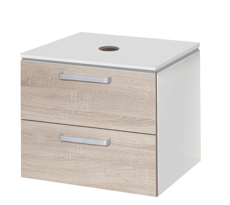 Skrinka pod umývadlovú misu - biely korpus, čelá zásuviek dub bardolino, horná doska biela. Zásuvka majú plnovýsuv s doťahom, dodávané v rozloženom stave. Kompatibilný s umývadlami na dosku, ktoré rozmerovo zodpovedajú technickému výkresu dosky. Skrinka je určená pre umývadlá do hmotnosti 15 kg.