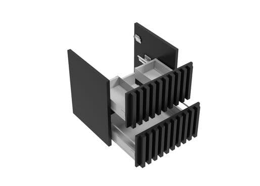 Závesná kúpeľňová skrinka pod umývadlo v čiernej farbe o rozmere 60x56x45 cm. Povrch v prevedení lamino.