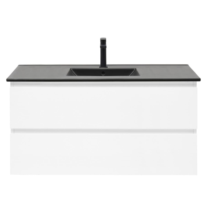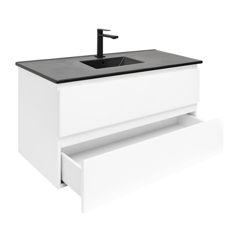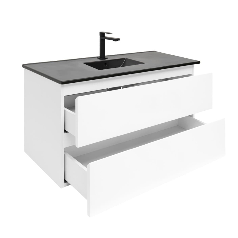 Závesná kúpeľňová skrinka s keramickým umývadlom v bielej farbe s lesklým povrchom o rozmere 99x50x45 cm. Povrch v prevedení lamino.