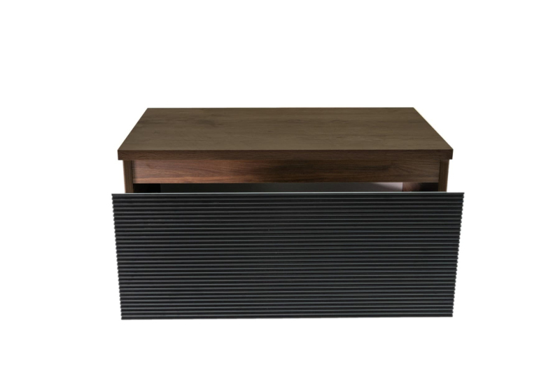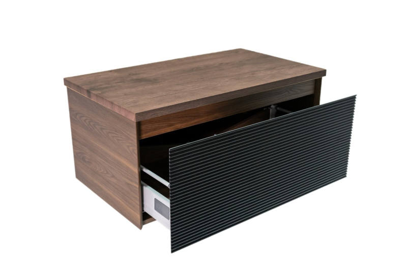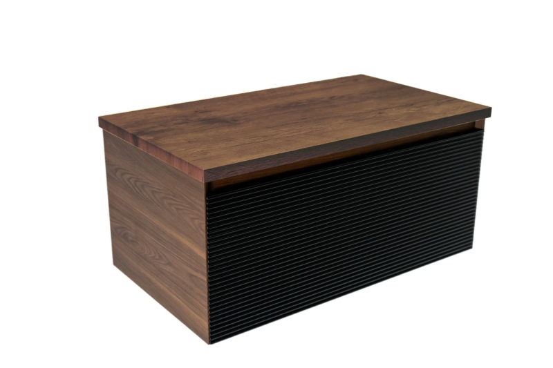 Závesná kúpeľňová skrinka s krycou doskou v dekore orech s matným povrchom o rozmere 79x30x45 cm. Povrch v prevedení lamino.