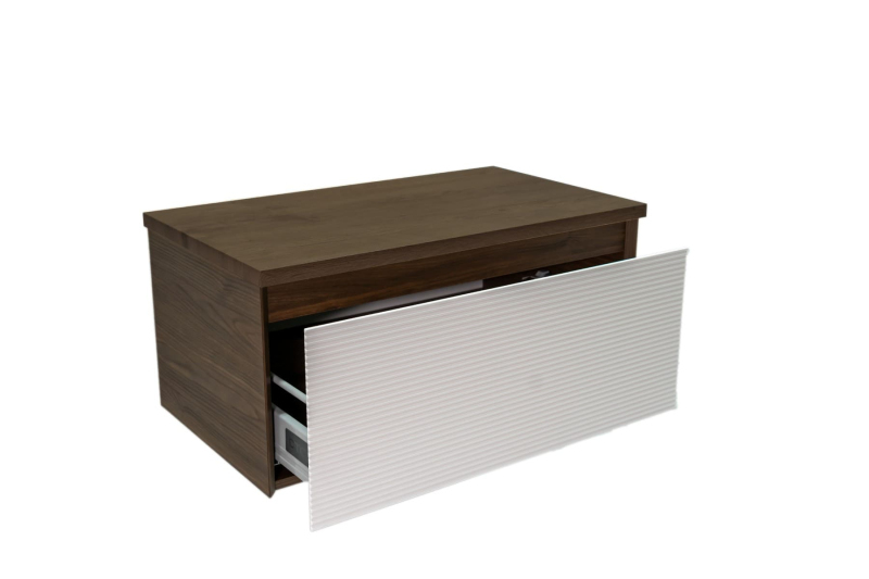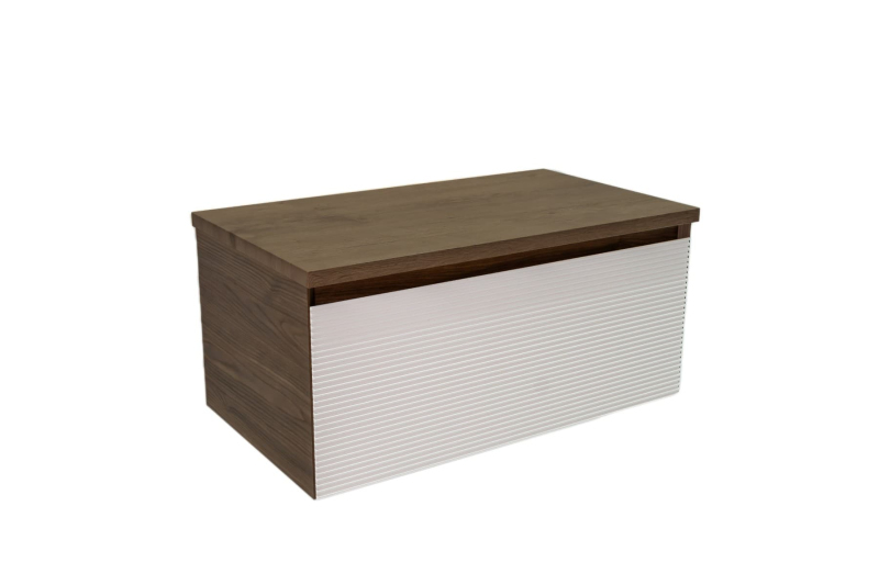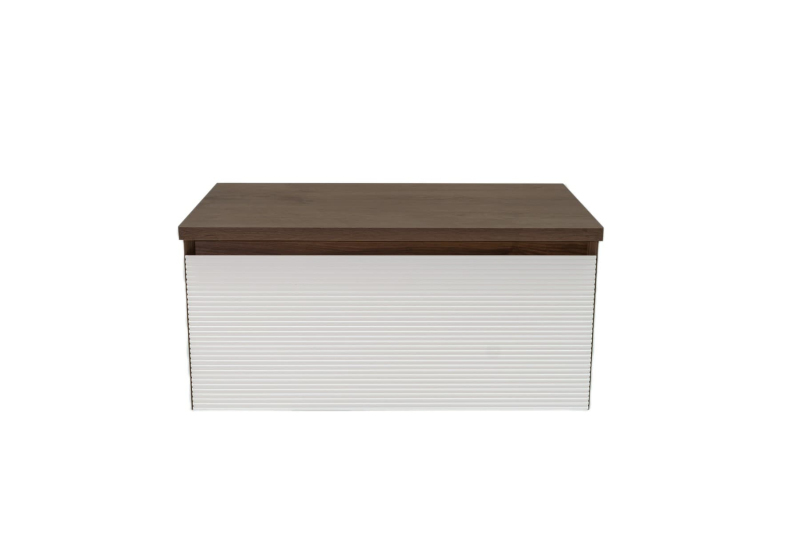 Závesná kúpeľňová skrinka s krycou doskou v dekore orech s matným povrchom o rozmere 79x30x45 cm. Povrch v prevedení lamino.