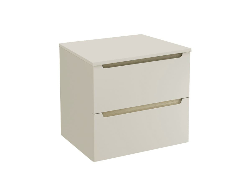 Závesná kúpeľňová skrinka s krycou doskou vo farebnom prevedení kašmír s matným povrchom o rozmere 60x60x45 cm. S povrchom z MDF dosky. S plnovýsuvom a doťahom.