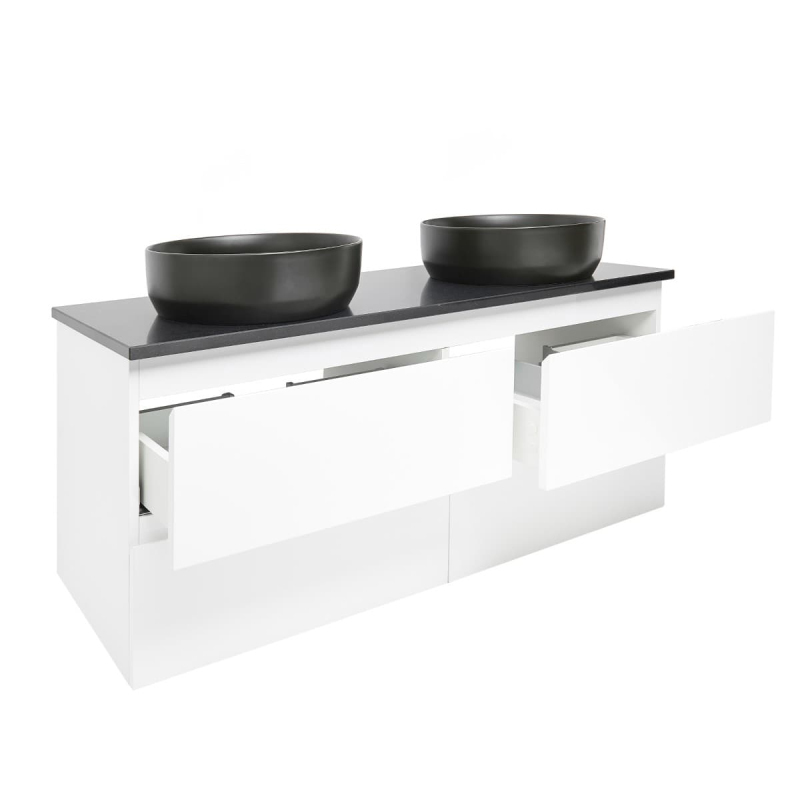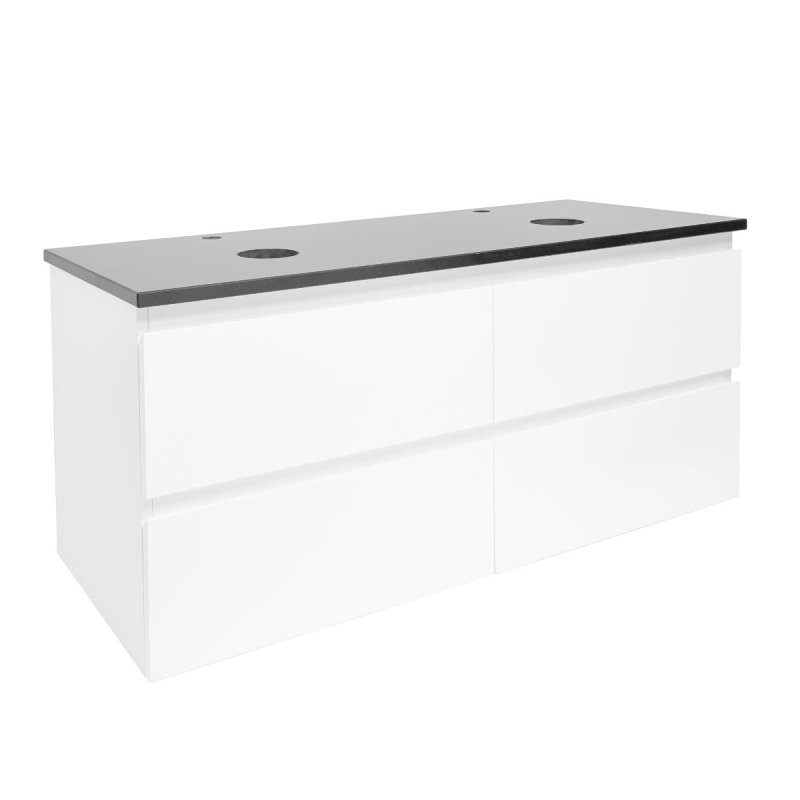 Závesná kúpeľňová skrinka s krycou doskou v bielej farbe v lesklom prevedení o rozmere 119x50x45 cm. Povrch v prevedení lamino.
