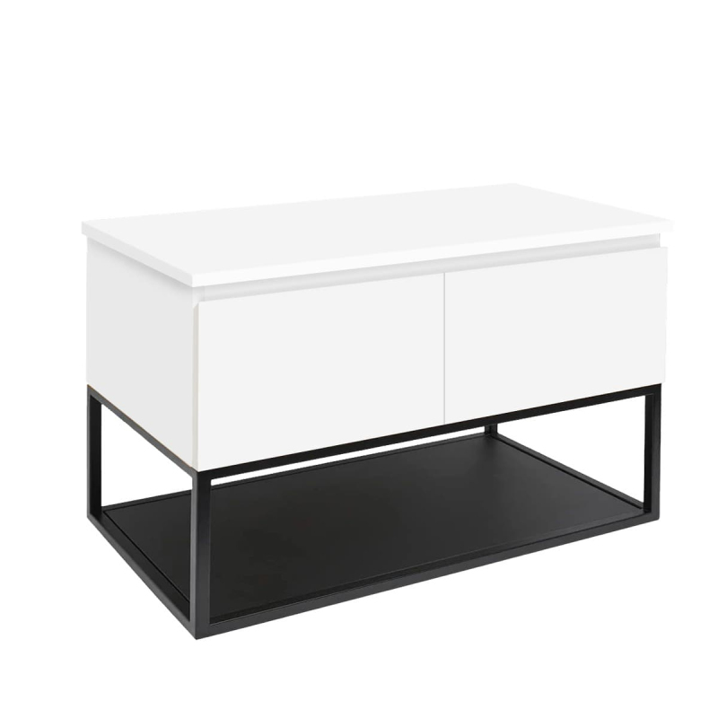 Závesná kúpeľňová skrinka s krycou doskou v bielej farbe s lesklým povrchom o rozmere 119x57x45 cm. S lakovaným povrchom.