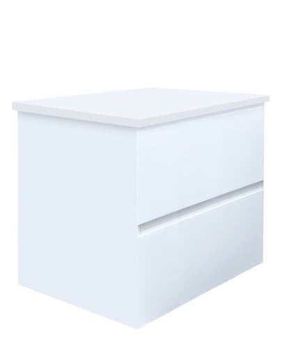 Závesná kúpeľňová skrinka s krycou doskou v bielej farbe s lesklým povrchom o rozmere 59x50x45 cm. S lakovaným povrchom.