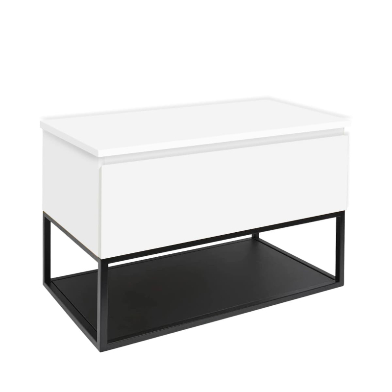 Závesná kúpeľňová skrinka s krycou doskou v bielej farbe s lesklým povrchom o rozmere 99x57x45 cm. S lakovaným povrchom.