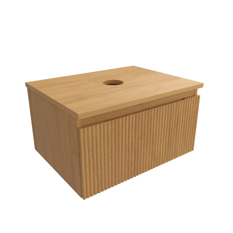 Závesná kúpeľňová skrinka s krycou doskou vo farbe dub medový s matným povrchom o rozmere 58x30x44,5 cm. Povrch v prevedení lamino.