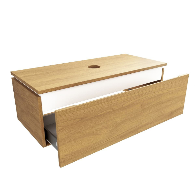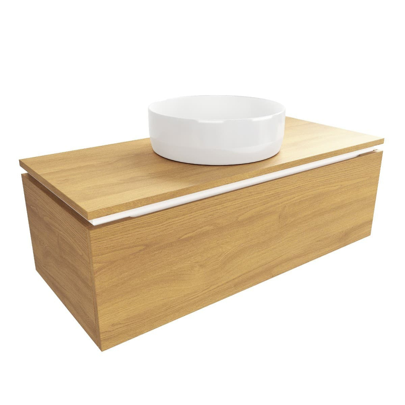 Závesná kúpeľňová skrinka s krycou doskou vo farebnom prevedení medový dub v lesklom prevedení o rozmere 100x30x46 cm. Povrch v prevedení lamino.