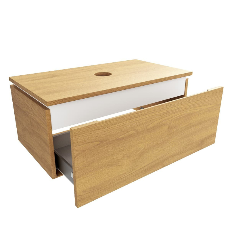 Závesná kúpeľňová skrinka s krycou doskou vo farebnom prevedení medový dub s matným povrchom o rozmere 80x30x46 cm. Povrch v prevedení lamino.