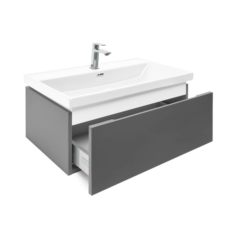 Závesná kúpeľňová skrinka s keramickým umývadlom v antracitovej farbe s matným povrchom o rozmere 80x30x44,8 cm. Povrch v prevedení lamino.