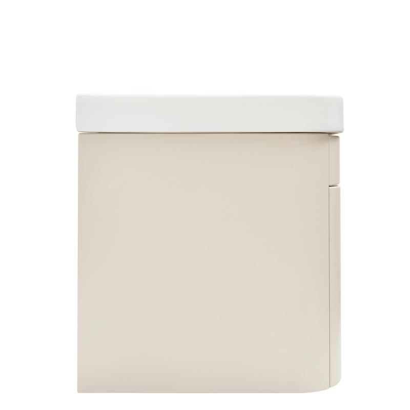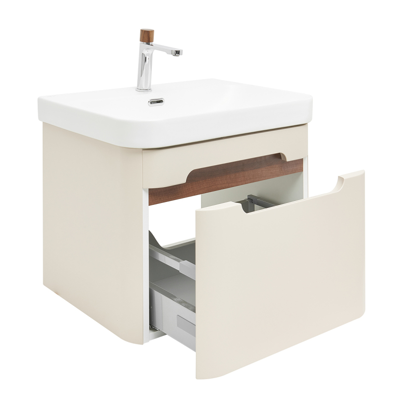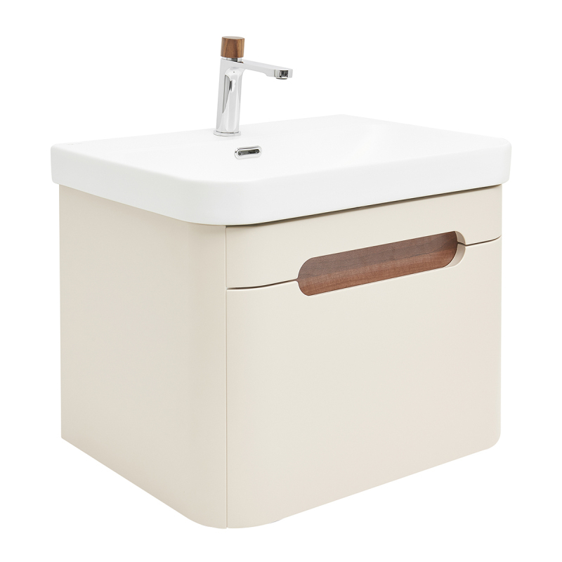 Závesná kúpeľňová skrinka s keramickým umývadlom v prevedení pieskovo béžová s matným povrchom o rozmere 57,5x43x45 cm. Povrch v prevedení lamino.