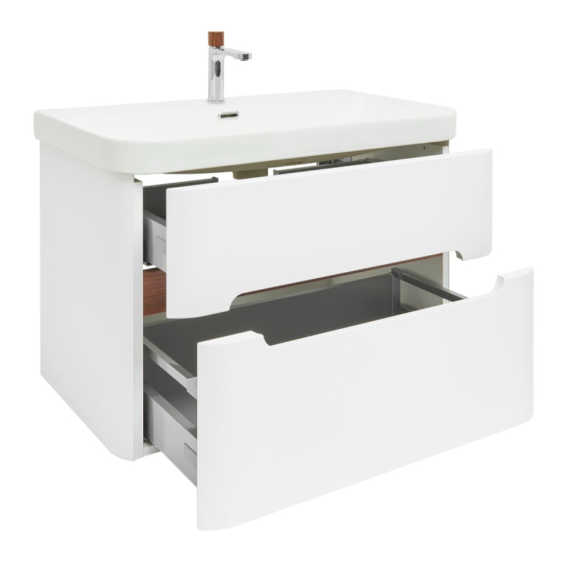 Závesná kúpeľňová skrinka s keramickým umývadlom v bielom matnom prevedení s matným povrchom o rozmere 77,5x53x45 cm. Povrch v prevedení lamino.