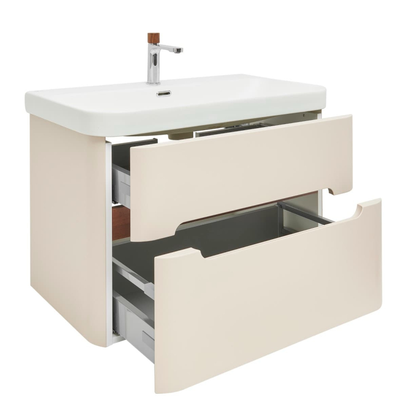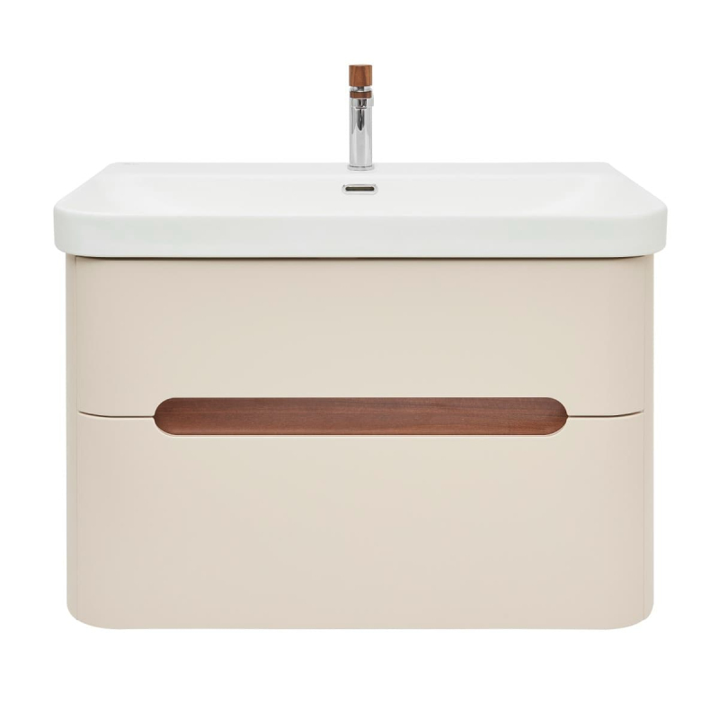 Závesná kúpeľňová skrinka s keramickým umývadlom v prevedení pieskovo béžová s matným povrchom o rozmere 77,5x53x45 cm. Povrch v prevedení lamino.