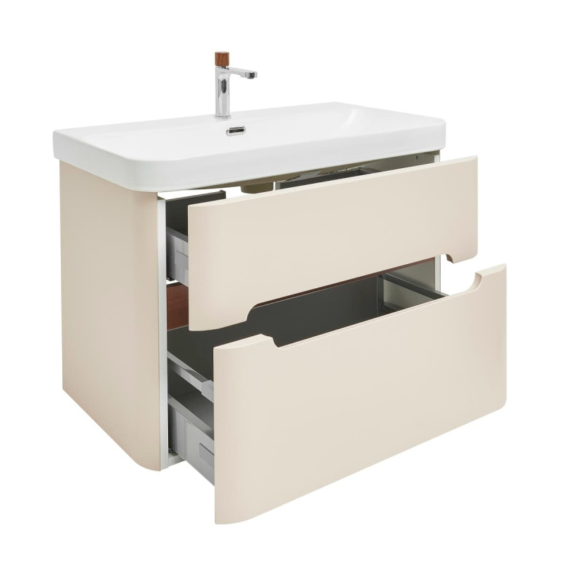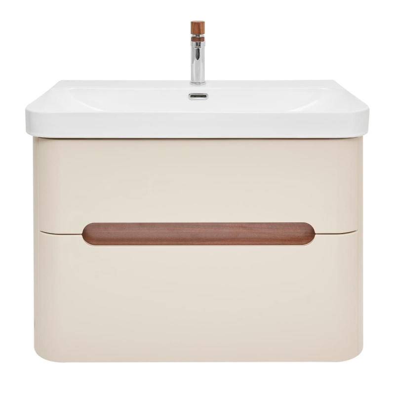 Závesná kúpeľňová skrinka s keramickým umývadlom v prevedení pieskovo béžová s matným povrchom o rozmere 77,5x53x45 cm. Povrch v prevedení lamino.