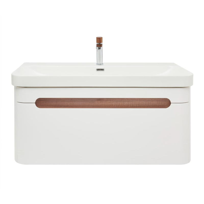 Závesná kúpeľňová skrinka s keramickým umývadlom v bielom matnom prevedení s matným povrchom o rozmere 97,5x43x45 cm. Povrch v prevedení lamino.