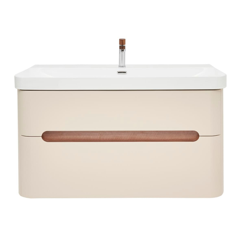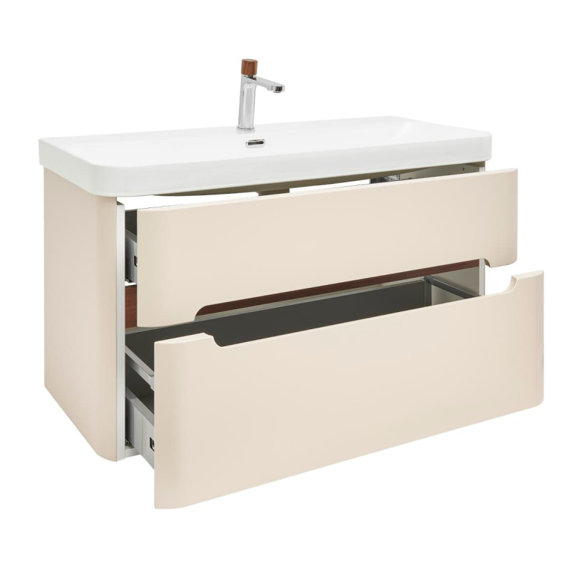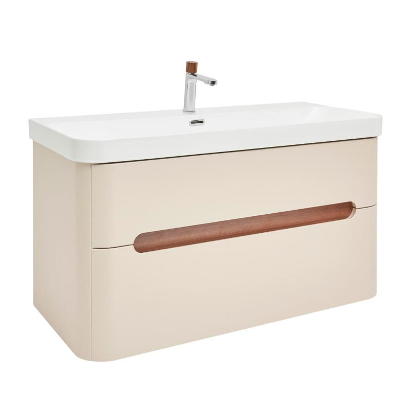 Závesná kúpeľňová skrinka s keramickým umývadlom v prevedení pieskovo béžová s matným povrchom o rozmere 97,5x53x45 cm. Povrch v prevedení lamino.