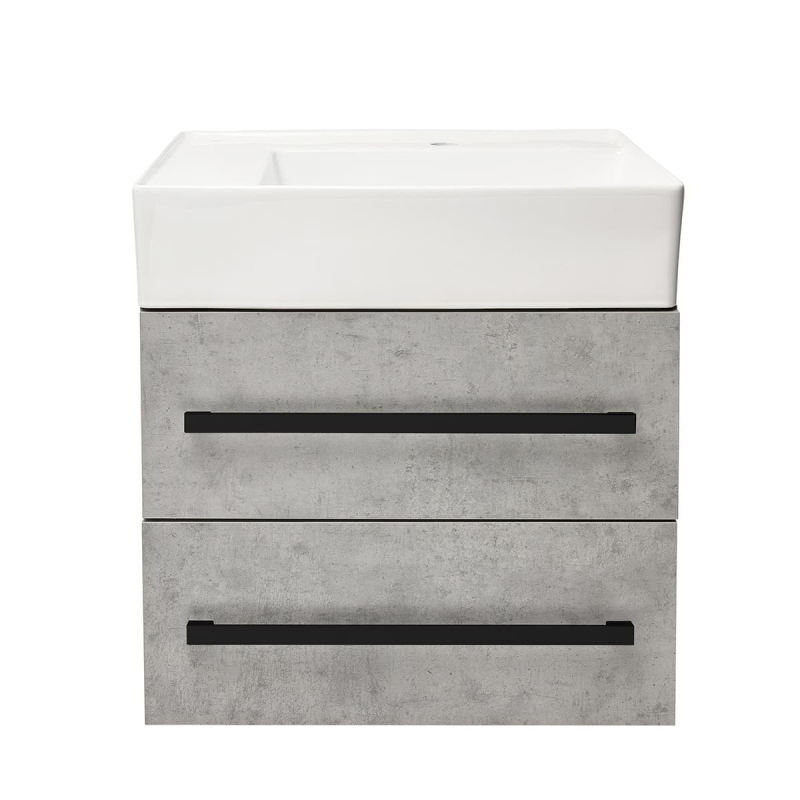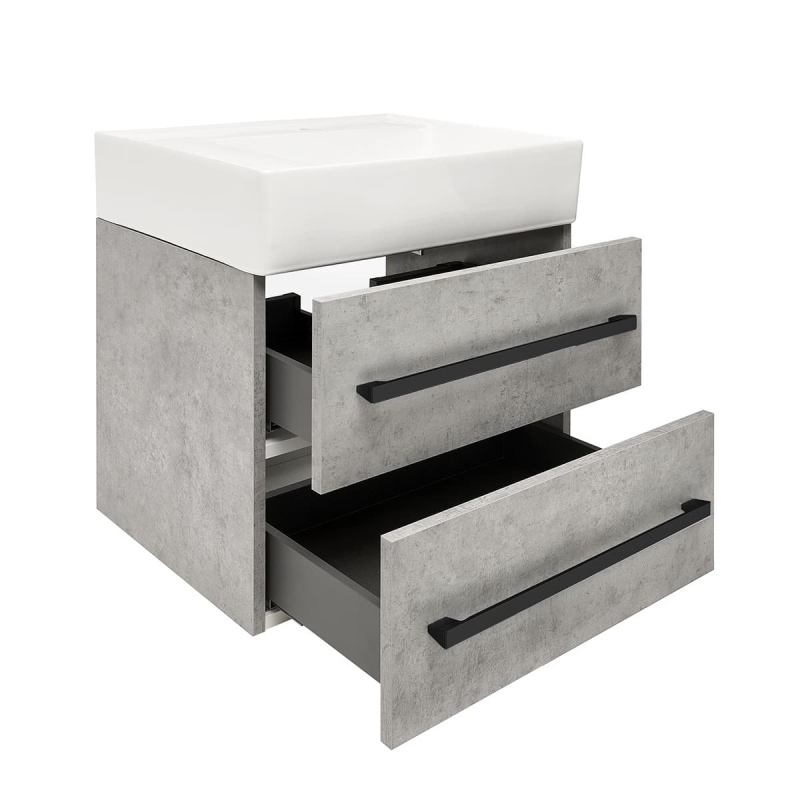 Závesná kúpeľňová skrinka s keramickým umývadlom v imitácii betónu s matným povrchom o rozmere 60x53x46 cm. Povrch v prevedení lamino.