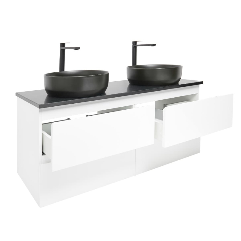 Závesná kúpeľňová skrinka s keramickým umývadlom v bielej farbe v lesklom prevedení o rozmere 119x50x45 cm. Povrch v prevedení lamino.