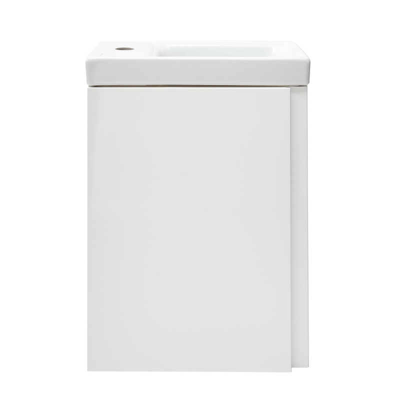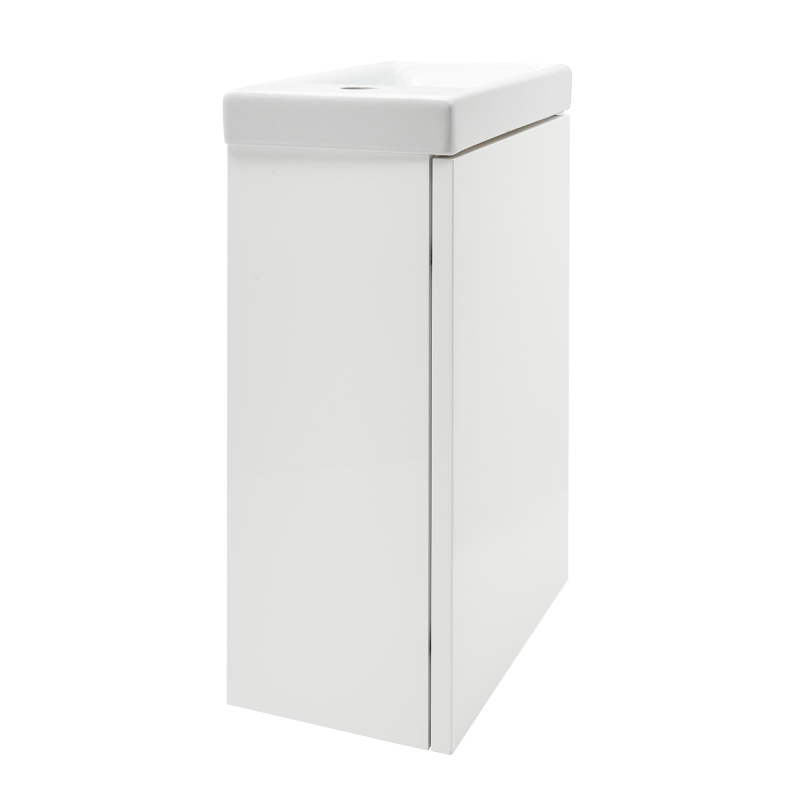 Závesná kúpeľňová skrinka s keramickým umývadlom v bielej farbe s lesklým povrchom o rozmere 40x21,5x64 cm s fóliovaným povrchom S pomalým zatváraním.